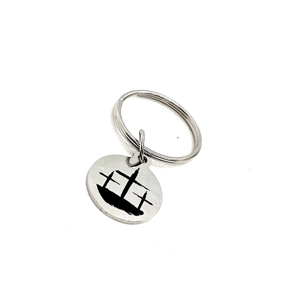 This is a wonderful keychain gift! It has a stainless steel laser engraved charm with three crosses on it. The charm measures approx. 3/4 inch across.