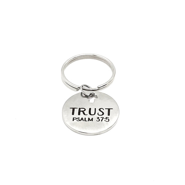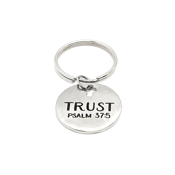 This is a wonderful keychain gift! It has stainless steel engraved charm with “Trust” from Psalm 37:5 on it. The charm measures approx. 1 inch cross.