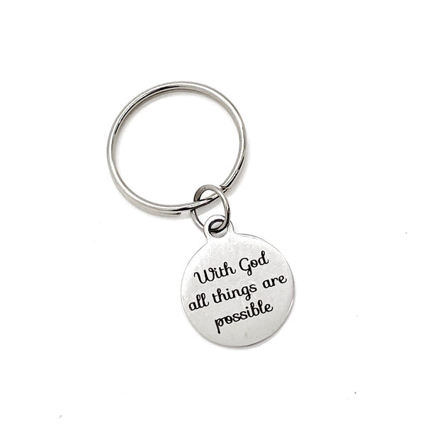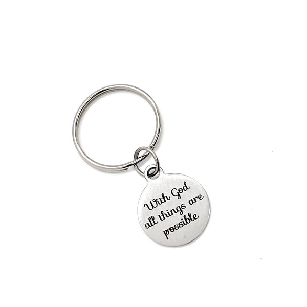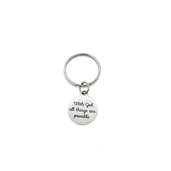 This is a wonderful keychain gift! It has stainless steel engraved charm with “With God all things are possible” from Mathew 19:26 on it. The charm measures approx. 3/4 inch cross.