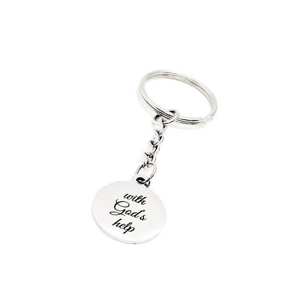 This is a great keychain gift! It has a stainless steel laser engraved charm with “with God’s help” on it.