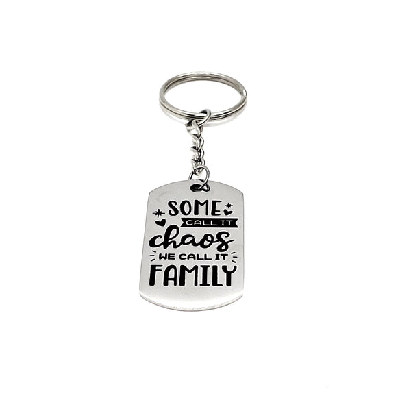 This is a great keychain gift! It has a stainless steel laser engraved charm with “Some call it chaos, we call it family” on it.