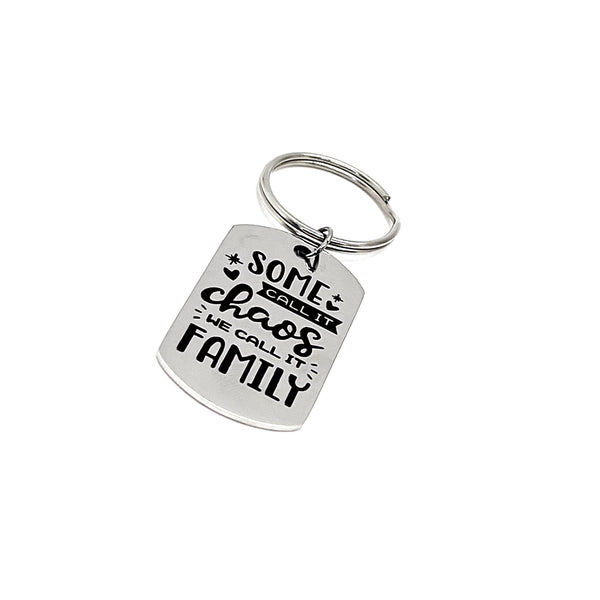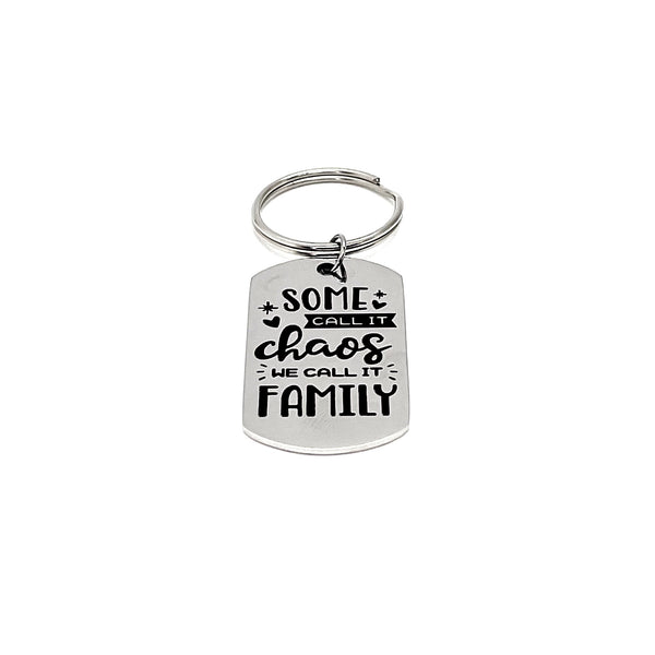 This is a great keychain gift! It has a stainless steel laser engraved charm with “Some call it chaos, we call it family” on it.