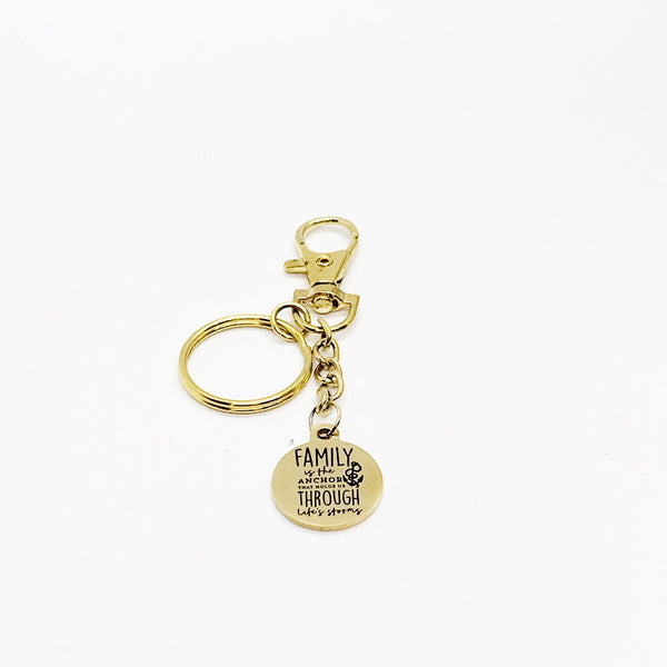 This is a great goldtone keychain gift . The keyring can be clipped onto your bag to make it easy to access without digging to the bottom of the bag. It has a goldtone stainless steel “Family is the anchor that holds us through life’s storms” charm on it.