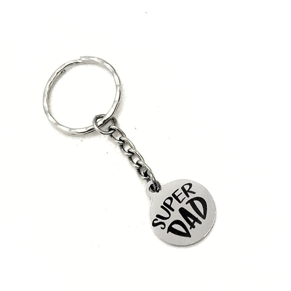 This is a great gift for Dad! It has a stainless steel laser engraved charm with “Super Dad" on it. The charm measures approx. 3/4 inch.