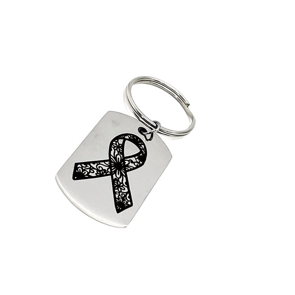 This is a great keychain gift! It has a stainless steel laser engraved charm with a floral Awareness Ribbon on it.