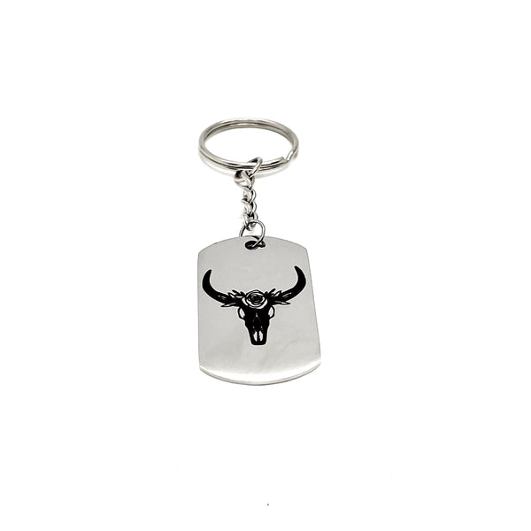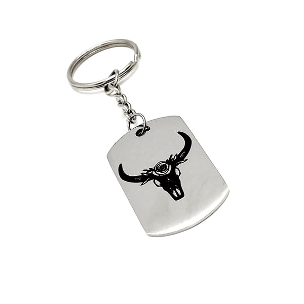 This is a great keychain gift! It has a stainless steel laser engraved charm with a floral cattle skull on it: