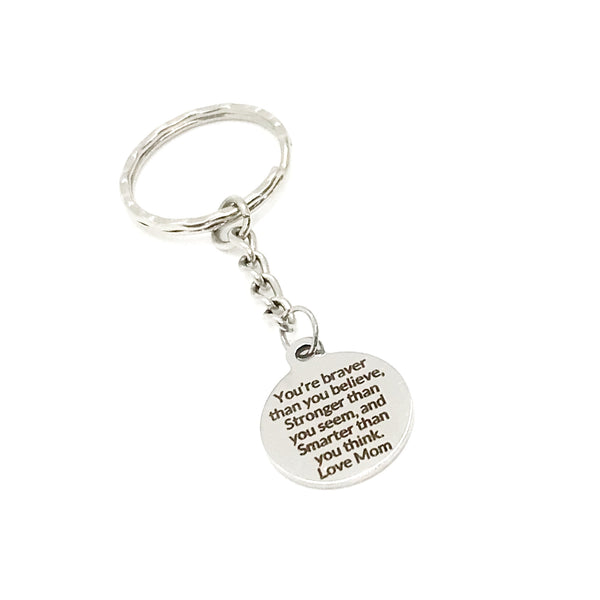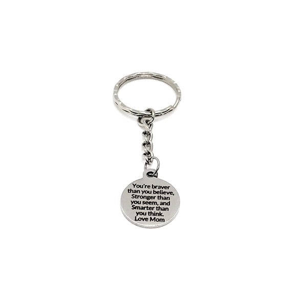 This is a great keychain gift with a stainless steel laser engraved charm with “You’re braver than you believe, Stronger than you seem, and Smarter than you think. Love Mom” on it.
