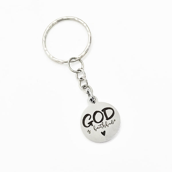 This is a wonderful Christian keychain gift! It has a stainless steel laser engraved charm with “God is faithful" on it.