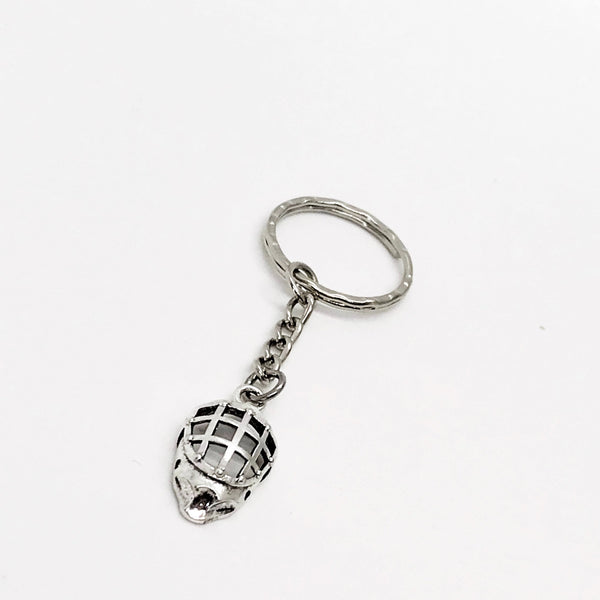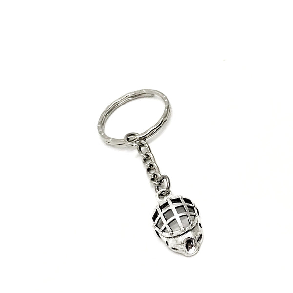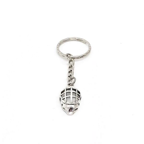 This is a keychain with a silvertone hockey mask.