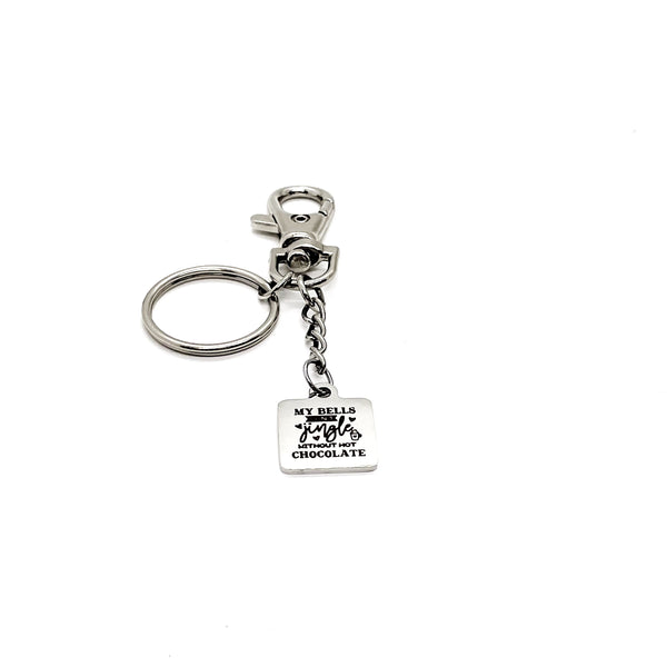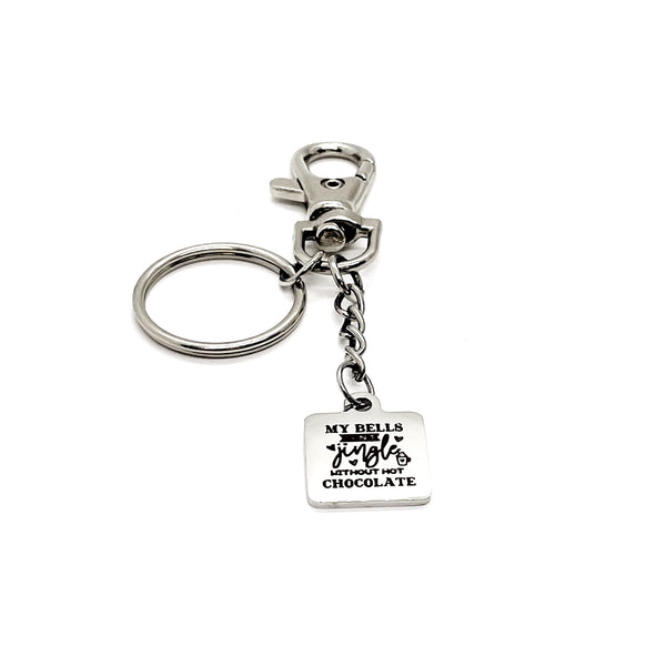 This is a fun keychain gift . The keyring can be clipped onto your bag to make it easy to access without digging to the bottom of the bag. It has a stainless steel laser engraved charm with “My bells don’t jingle without hot chocolate” on it.