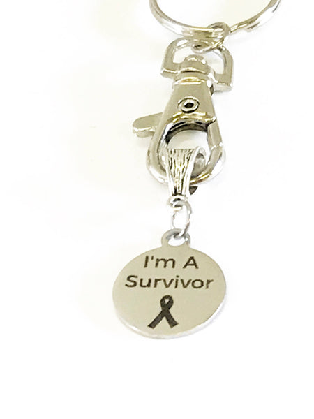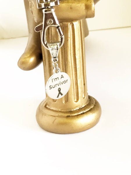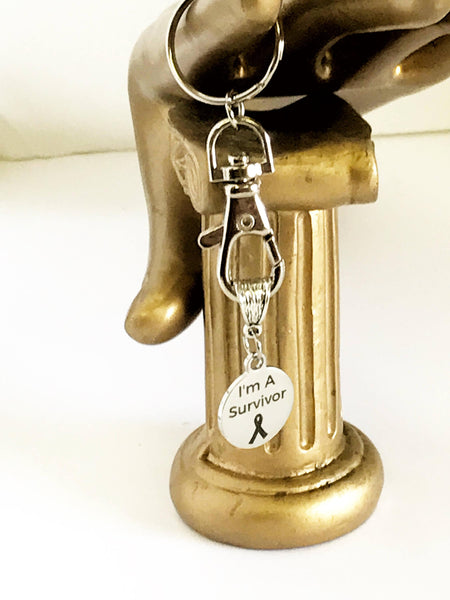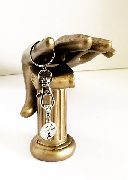 This keychain includes a stainless steel laser engraved charm that says "I Am A Survivor" with a cancer awareness ribbon.