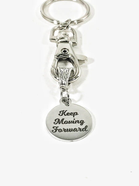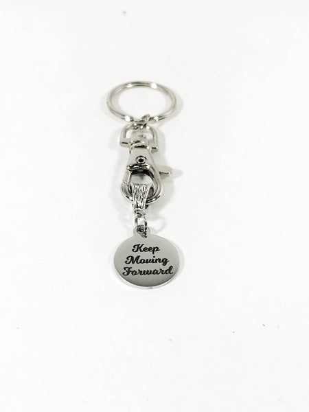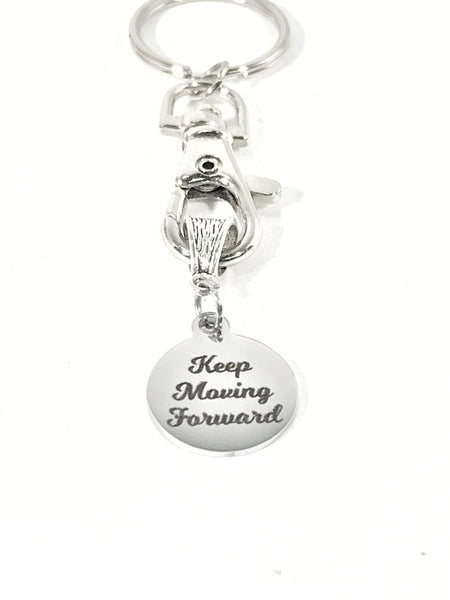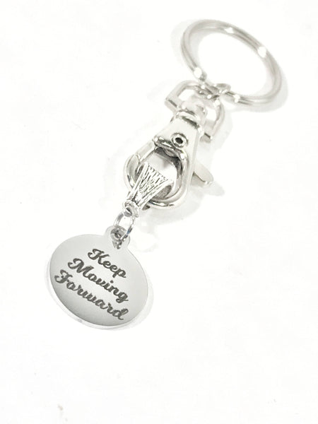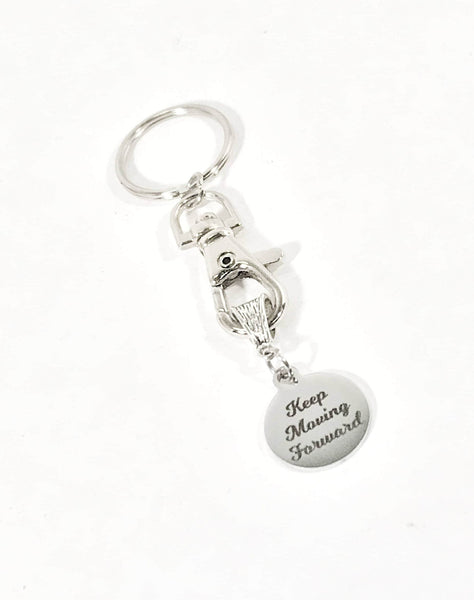 This is a beautiful keychain to serve as a reminder to "Keep Moving Forward" The charm is a stainless steel laser engraved charm. The charm measures approx. 3/4 inch across.