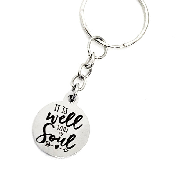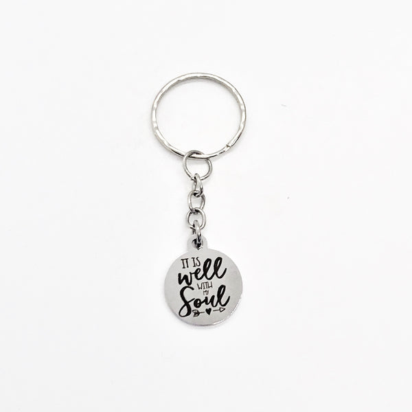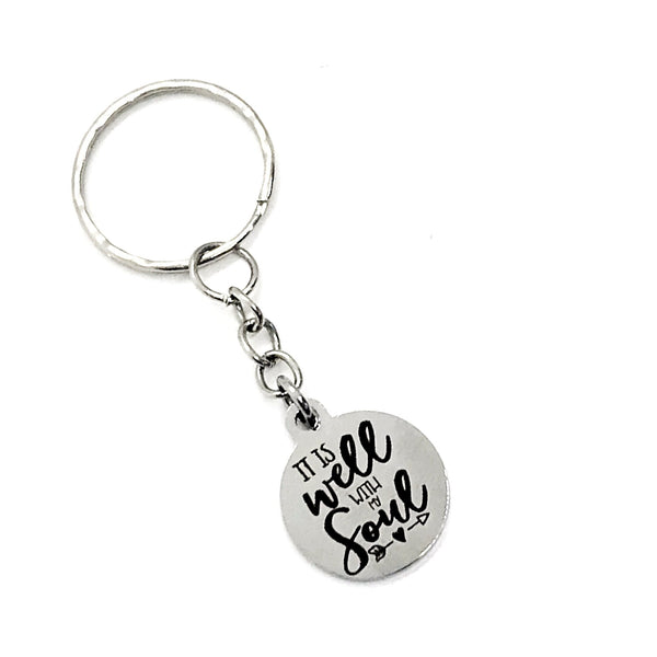 This is a wonderful Christian keychain gift! It has a stainless steel laser engraved charm with “It is well with my soul" on it.