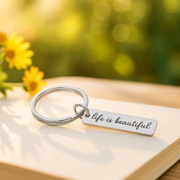 Carry a daily reminder of positivity with this Life is Beautiful stainless steel keychain. Featuring a sleek 8mm x 34mm rectangular charm with elegant engraved script, this keychain is both meaningful and practical.