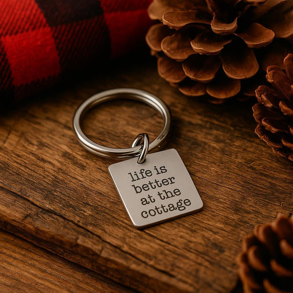 Bring the charm of cottage life wherever you go with this Life is Better at the Cottage stainless steel keychain. Featuring a 19mm square charm with a simple engraved message, this durable accessory is perfect for anyone who loves weekends at the lake, cozy cabin getaways, or time spent surrounded by nature.