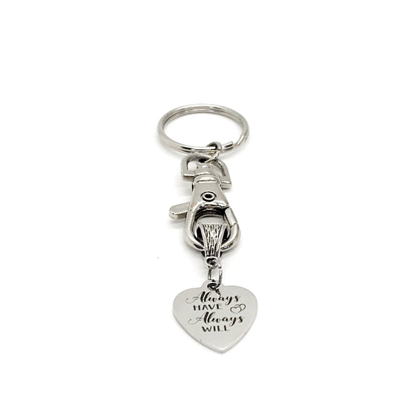 This keychain gift would make a great keychain gift. It has a stainless steel laser engraved charm with “Always have, Always will” on it.