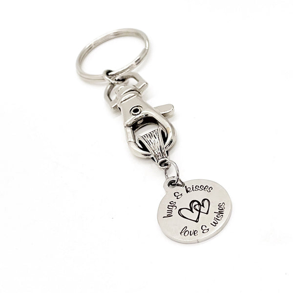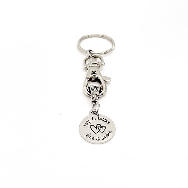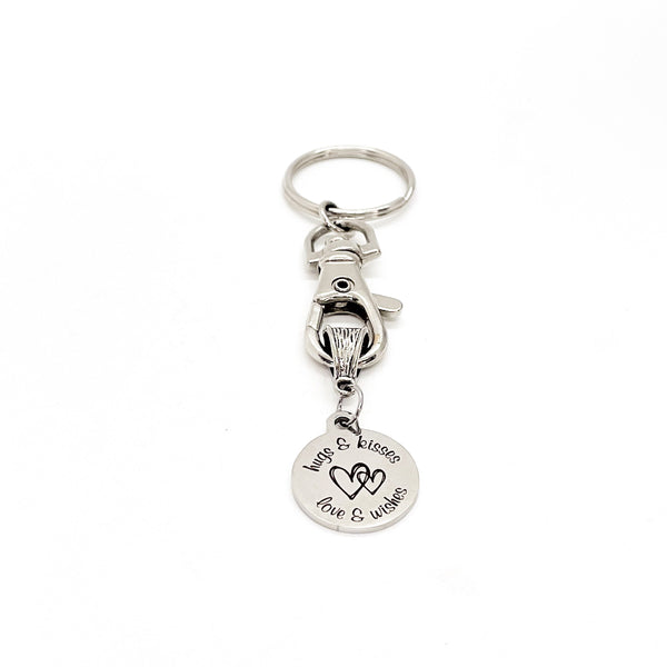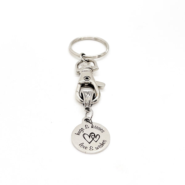 This is a great keychain that has a stainless steel laser engraved charm which says, "Hugs & Kisses, Love & Wishes".
