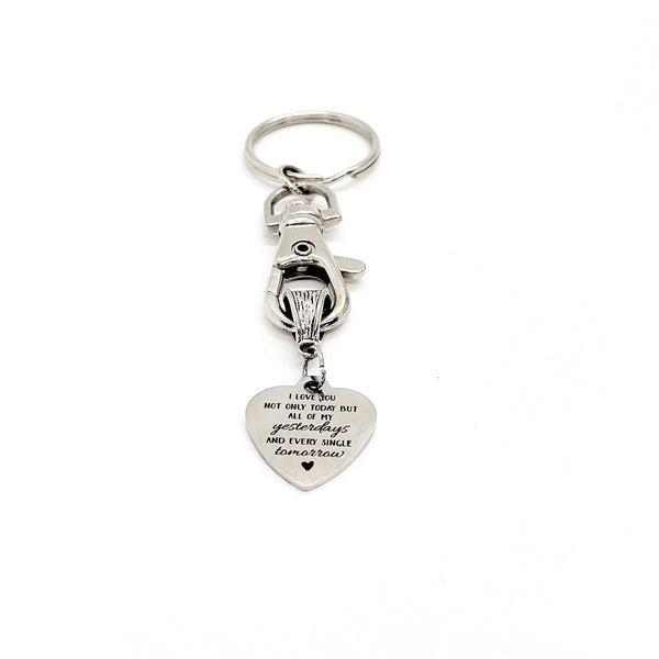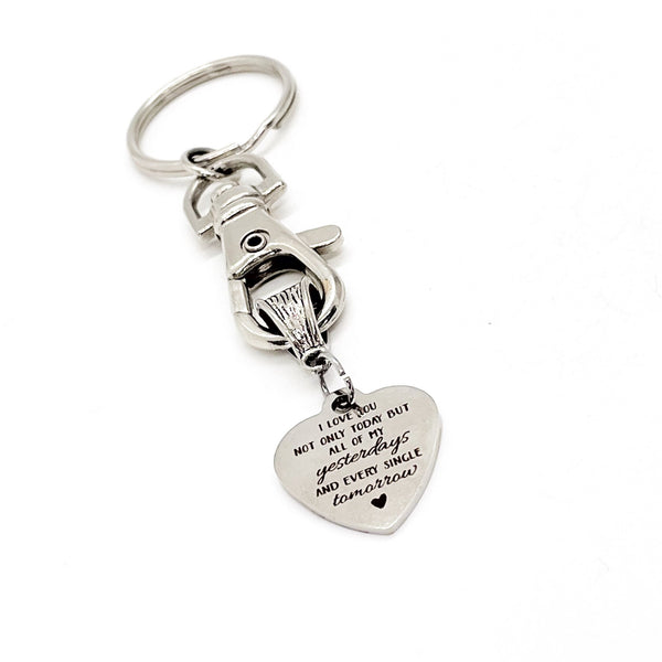 This is a great keychain that has a stainless steel laser engraved charm which says, "I love you not only today but all of my yesterdays and every single tomorrow".