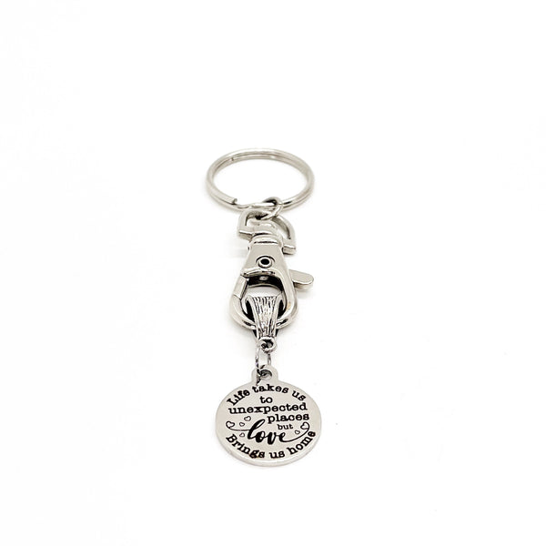 This is a great keychain that has a stainless steel laser engraved charm which says, "Life takes us to unexpected places. Love brings us home".