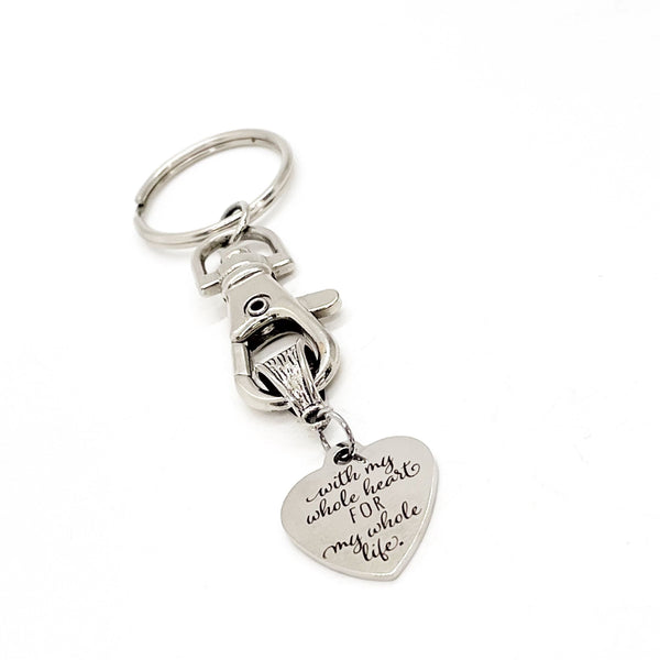This is a great keychain that has a stainless steel laser engraved charm which says, "With my whole heart for my whole life".