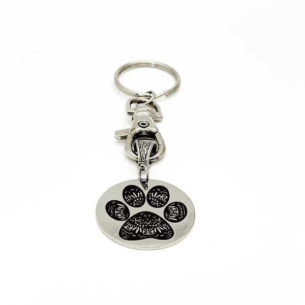 This keychain would make a great keychain gift. It has a stainless steel laser engraved charm with a mandala paw print on it.