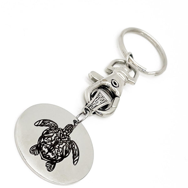 This keychain would make a great keychain gift. It has a stainless steel laser engraved charm with a mandala print turtle on it.