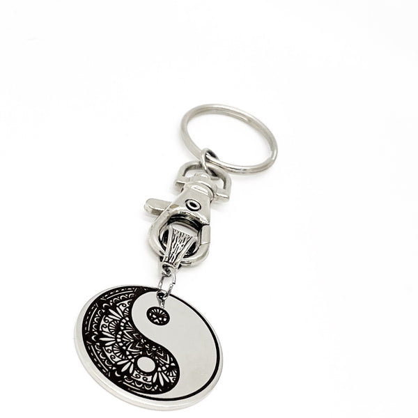 This keychain would make a great keychain gift. It has a stainless steel laser engraved charm with a mandala print yin yang symbol on it.