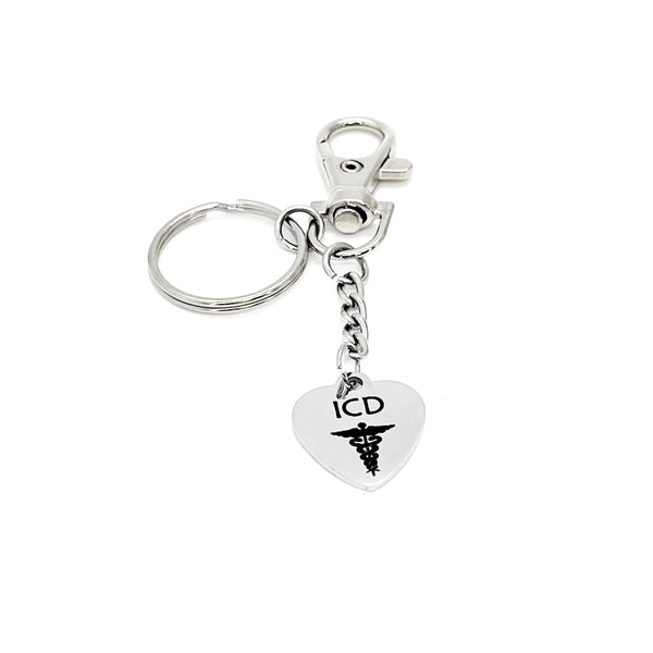 This is a great keychain gift . The keyring can be clipped onto your bag to make it easy to access without digging to the bottom of the bag. It has a stainless steel laser engraved charm with “ICD” and a medical caduceus image on it.