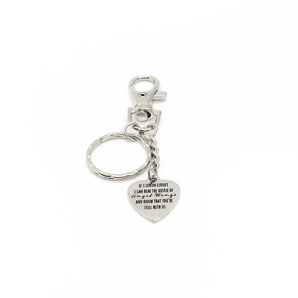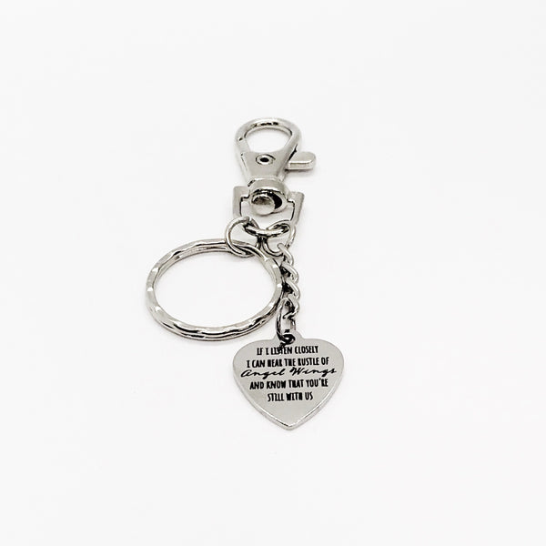 This is a great keychain gift . The keyring can be clipped onto your bag to make it easy to access without digging to the bottom of the bag. It has a stainless steel laser engraved charm with “If I listen closely, I can hear the rustle of angel wings and know that you’re still with us” on it.
