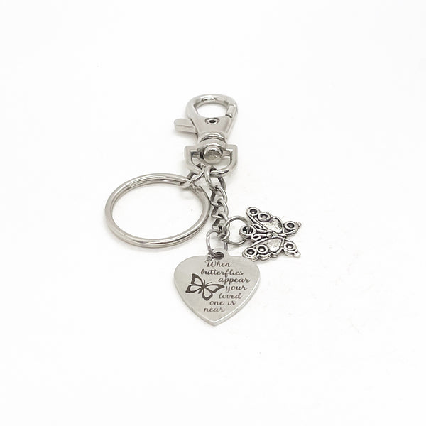 This is a clip-on keychain gift . The keyring can be clipped onto your bag to make it easy to access without digging to the bottom of the bag. It has a stainless steel laser engraved charm with “When butterflied appear your loved one is near” and a small butterfly on it.