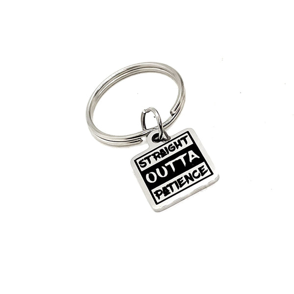 This is a wonderful keychain gift! It has a stainless steel laser engraved charm with “Straight outta patience” on it. The charm measures approx. 1/2 inch across.