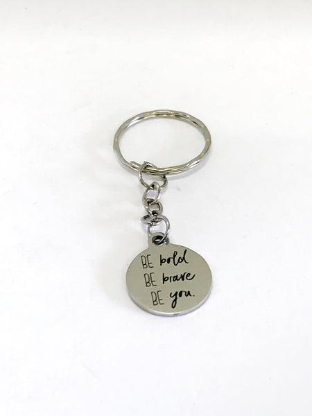 This is a great keychain gift to encourage someone to be just who they are. This would make a great motivating gift for someone staring a new career or a new venture. It has a stainless steel laser engraved charm with “Be bold Be brave Be you” on it.