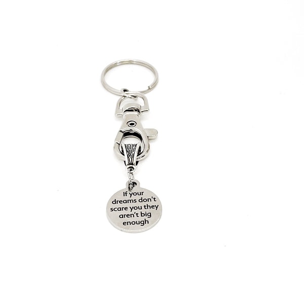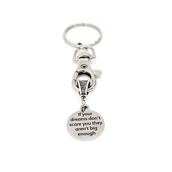 This keychain would make a great gift. It has a stainless steel laser engraved charm with “If your dreams don’t scare you they aren’t big enough” on it.