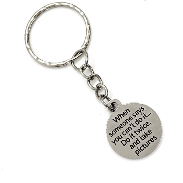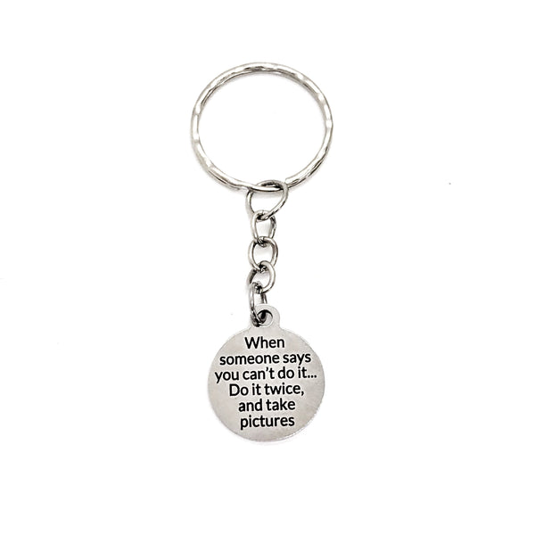 This is a great gift of encouragement! It has a stainless steel laser engraved charm with “When someone says you can’t do it... Do it twice and take pictures." on it.