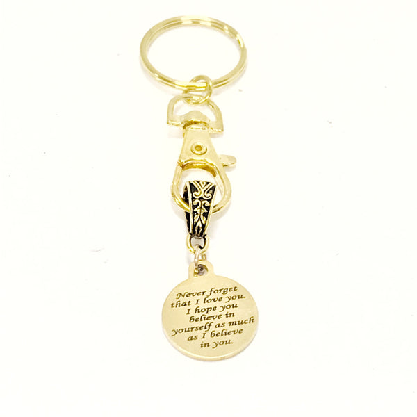 This is a great encouragement keychain that has a goldtone stainless steel laser engraved charm which says, "Never forget that I love you. I hope you believe in yourself as much as I believe in you" on it.