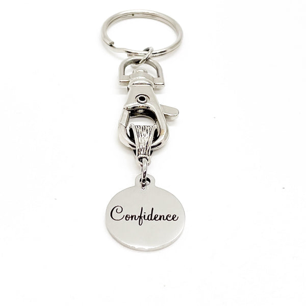 This is a great keychain that has a stainless steel laser engraved charm which says, "Confidence". This is a great motivational keychain for someone working to reach a goal.