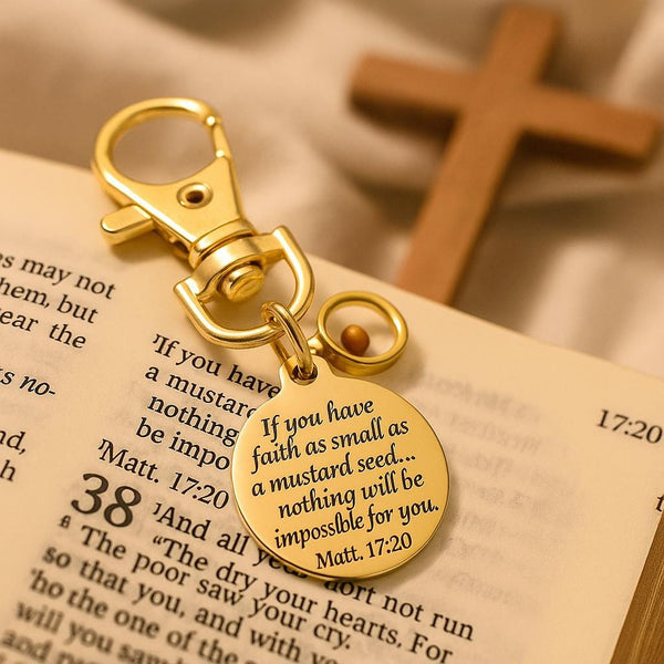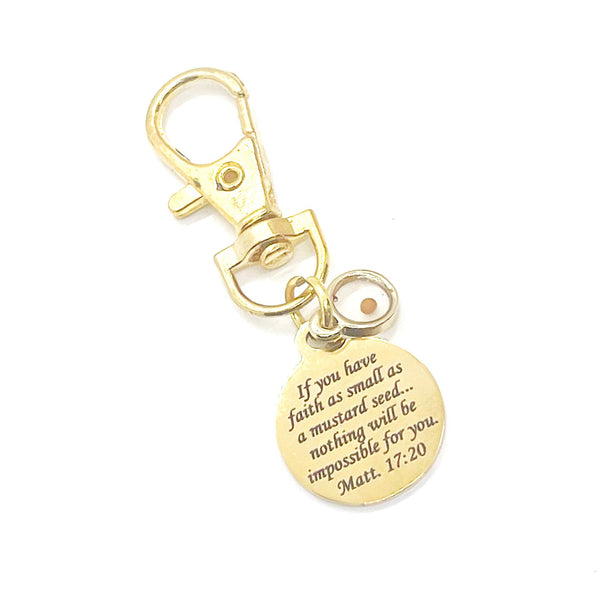 Carry a daily reminder of the power of faith with this Matthew 17:20 Mustard Seed Clip-On Charm. Beautifully engraved in gold stainless steel, it reads: