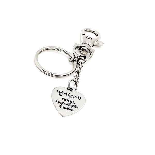 This is a great keychain gift. The keyring can be clipped onto your bag to make it easy to access without digging to the bottom of the bag. It has a stainless steel laser engraved charm with “Girl - a giggle with glitter and sunshine” on it. The charm measures approx. 1/2 inch across.
