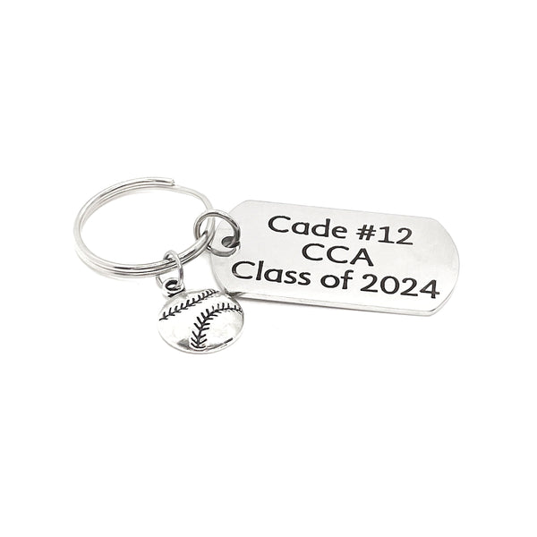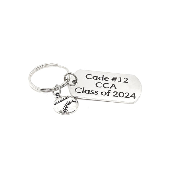 This is a great keychain gift for your favorite baseball player on your school team! It has a stainless steel laser engraved charm with first name jersey number, school and graduation year.