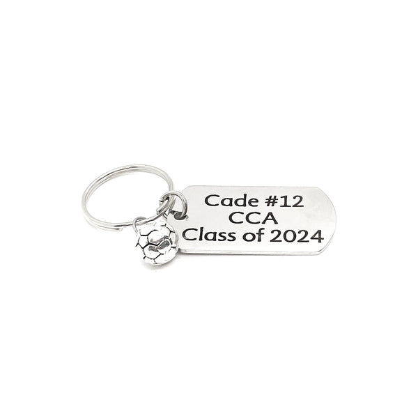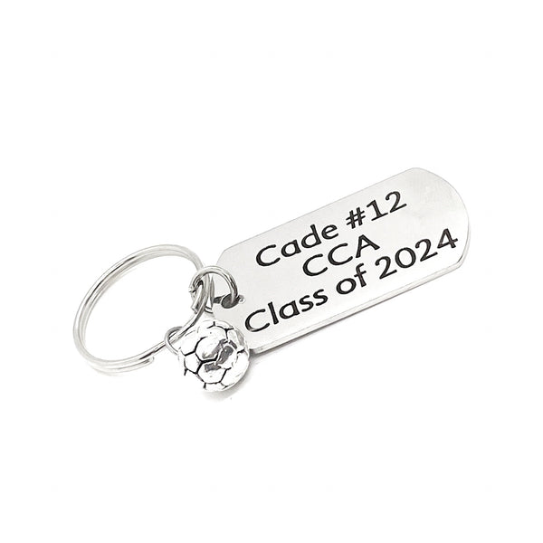 This is a great keychain gift for your favorite soccer players on your school team! It has a stainless steel laser engraved charm with first name jersey number, school and graduation year.