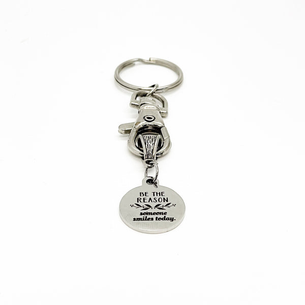 This keychain gift has a stainless steel laser engraved charm with “Be the reason someone smiles today” on it. The charm measures approx. 3/4 inch across.