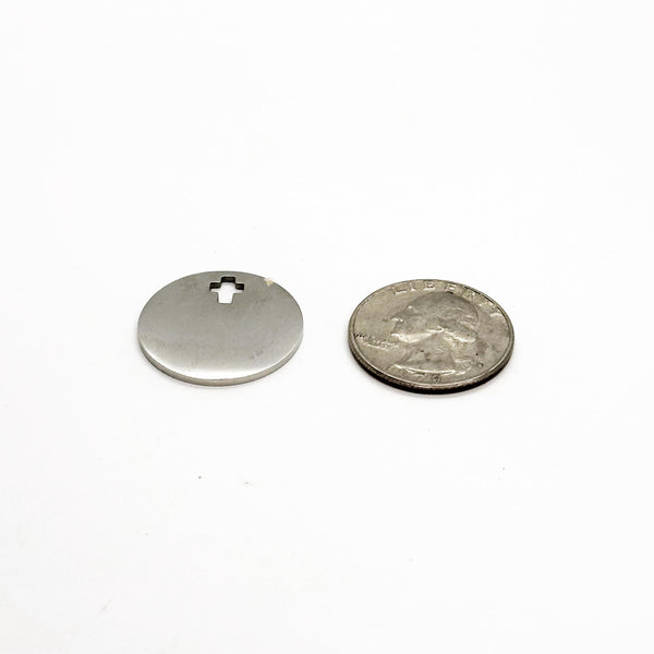 The round charm measures approximately 25mm and includes a cross cut-out where the charm connects to a V-shaped bale, adding a distinctive and symbolic design detail. Finished with a sturdy stainless steel keyring and lobster clasp, this keychain is perfect for keys, bags, backpacks, or purses.