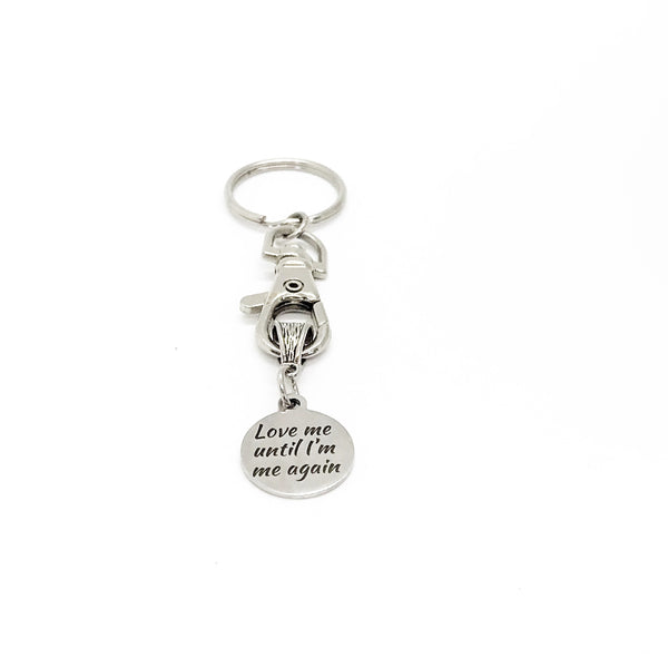 This keychain gift would make a great keychain gift. It has a stainless steel laser engraved charm with “Love me until I’m me again” on it.