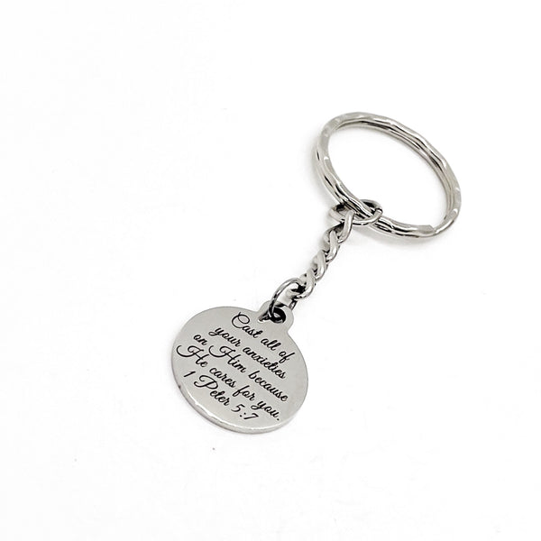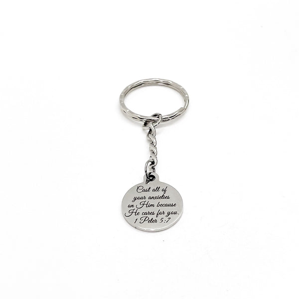 This is a great keychain gift. It has a stainless steel laser engraved charm that says, “Cast all of your anxieties on Him because He cares for you” from 1 Peter 5:7.