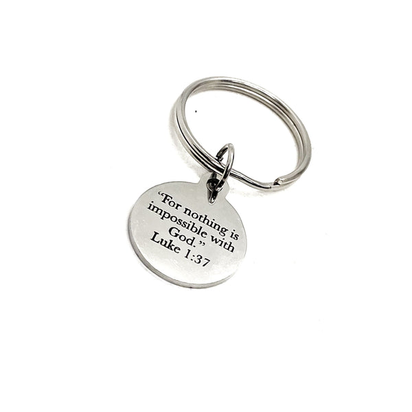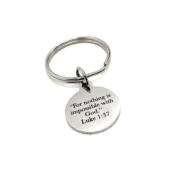 This is a wonderful keychain gift! It has a stainless steel laser engraved charm with “For nothing is impossible with God” from Luke 1:37 on it. The charm measures approx. 3/4 inch across.