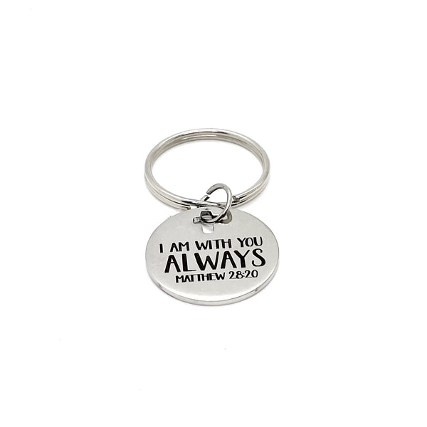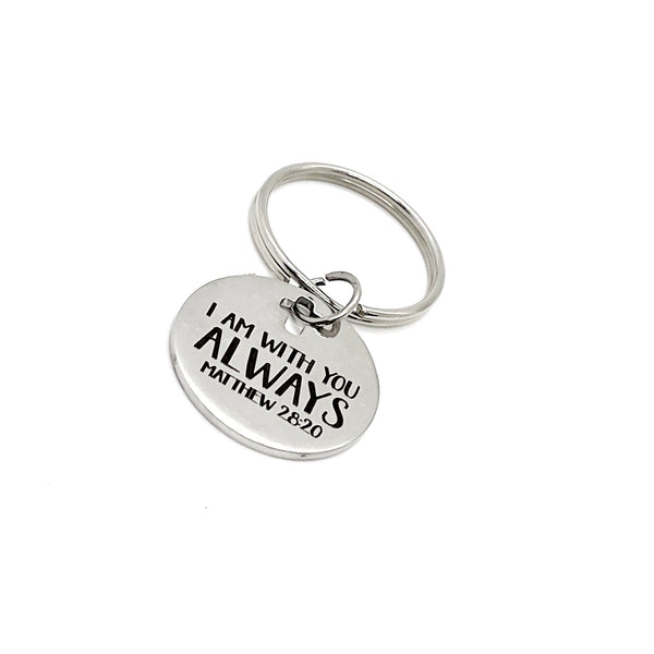 This is a wonderful keychain gift! It has stainless steel engraved charm with “I am with you alway” from Mathew 28:20 on it. The charms measures approx. 1 inch cross.
