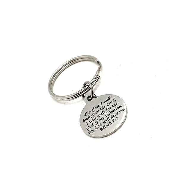 This is a wonderful keychain gift! It has a stainless steel laser engraved charm with “Therefore I will look unto the Lord: I will wait for the God of my salvation: my God will hear me.” from Micah 7:7 on it. The charm measures approx. 3/4 inch across.