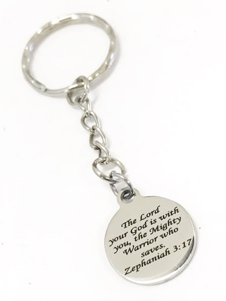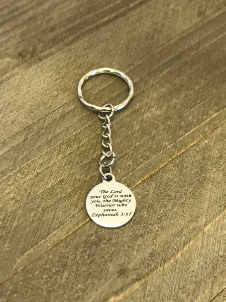This is a great scripture keychain gift. It has a stainless steel laser engraved charm with the Bible verse of Zephaniah 3:17 on it.