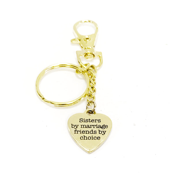 This is a great goldtone keychain gift . The keyring can be clipped onto your bag to make it easy to access without digging to the bottom of the bag. It has a goldplated stainless steel heart charm with “sisters by marriage friends by choice” on it.