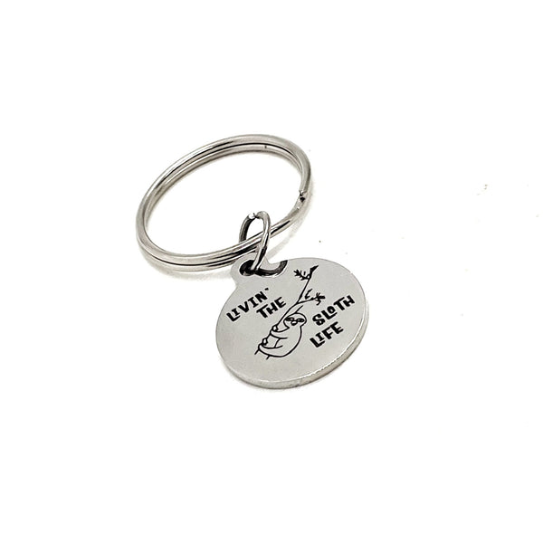 This is a wonderful keychain gift! It has a stainless steel laser engraved charm with “Livin’ the sloth life” on it. The sloth is a symbol of calmness, patience, relaxation and peace The charm measures approx. 3/4 inch across.